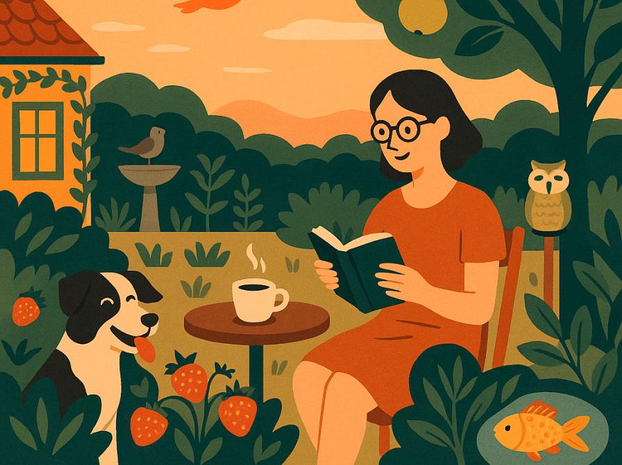 I haven har jeg placeret Fuglemanden. Det er bare en keramisk ugle på pind, men jeg bilder mig ind, at han passer på mine tomater. Måske kommer han i snak med Guldfisken Glimmer, der bor i regnvandstønden. Alting lever sit eget eventyr, når man har tid til at se efter.